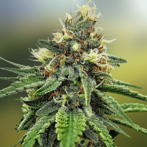 The aroma leans earthy and herbal with classic skunk character, layered with subtle sweetness and a lightly spicy edge that comes through more clearly in flavor. Plants produce dense, resin-coated flowers with bright orange hairs and a frosted layer of trichomes, reflecting the strength and consistency of its lineage.